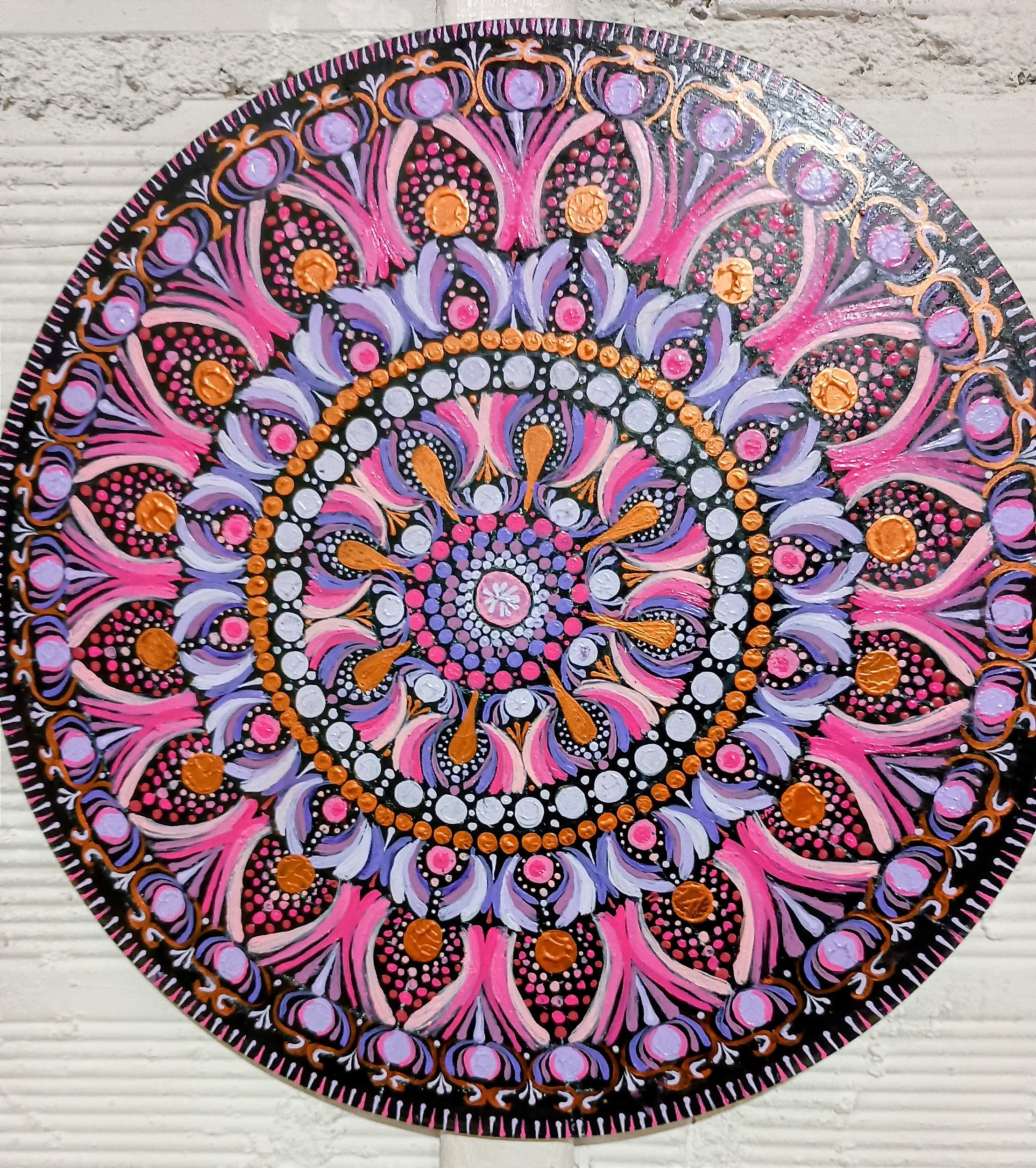 Mandala 30cm de MDF, pintada a mão, trabalha a energia amorosa e expansiva do chacra cardíaco .