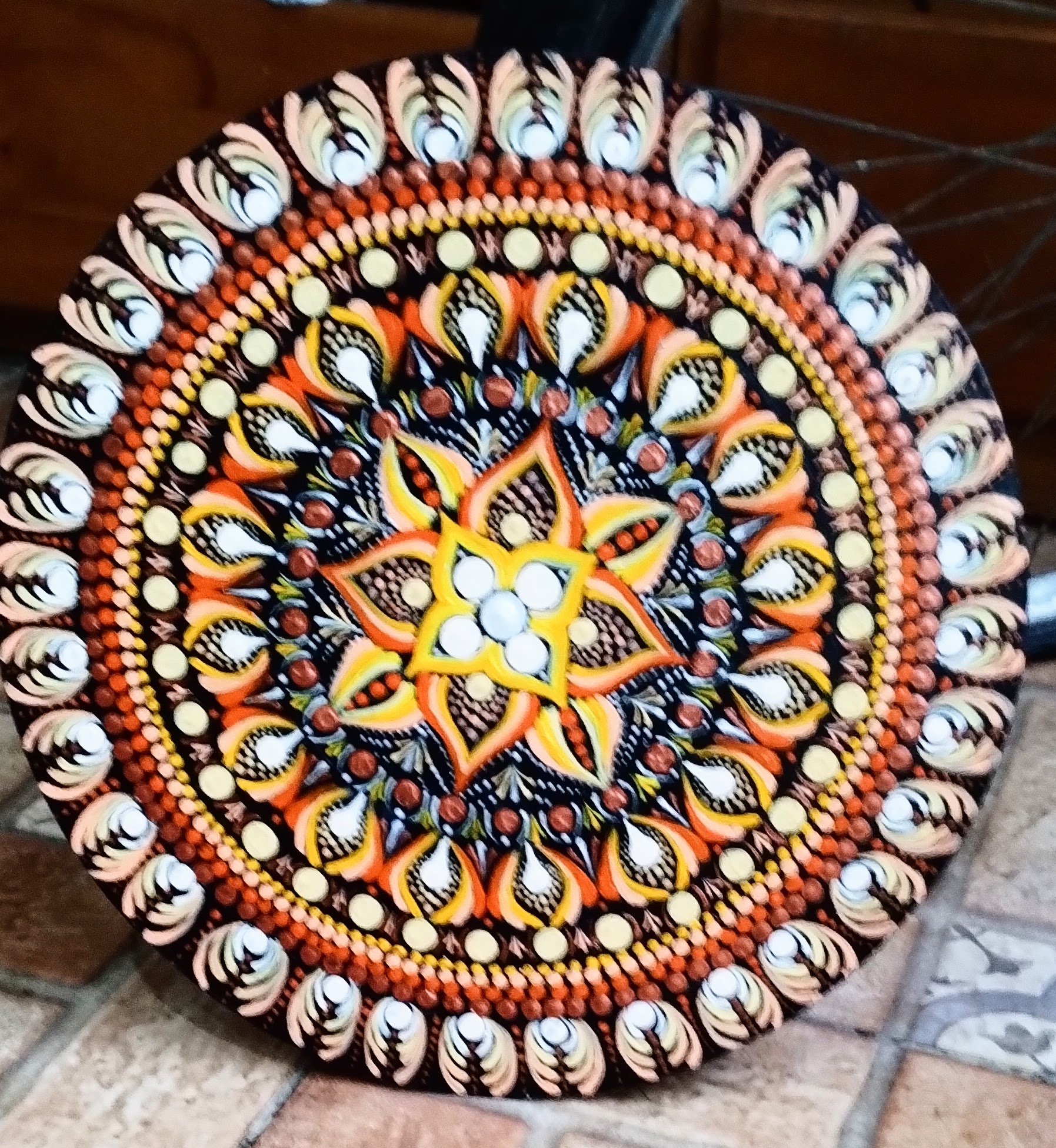 MANDALA SOLAR COM 35 CM DE DIÂMETRO FEITA EM MDF, PINTADA A MÃO . TRABALHA A ENERGIA DO SOL, DA AÇÃO, DA SABEDORIA E DA CRIATIVIDADE. pERFEITA PARA MEDITAR E EQUILIBRAR O PLEXO SOLAR.