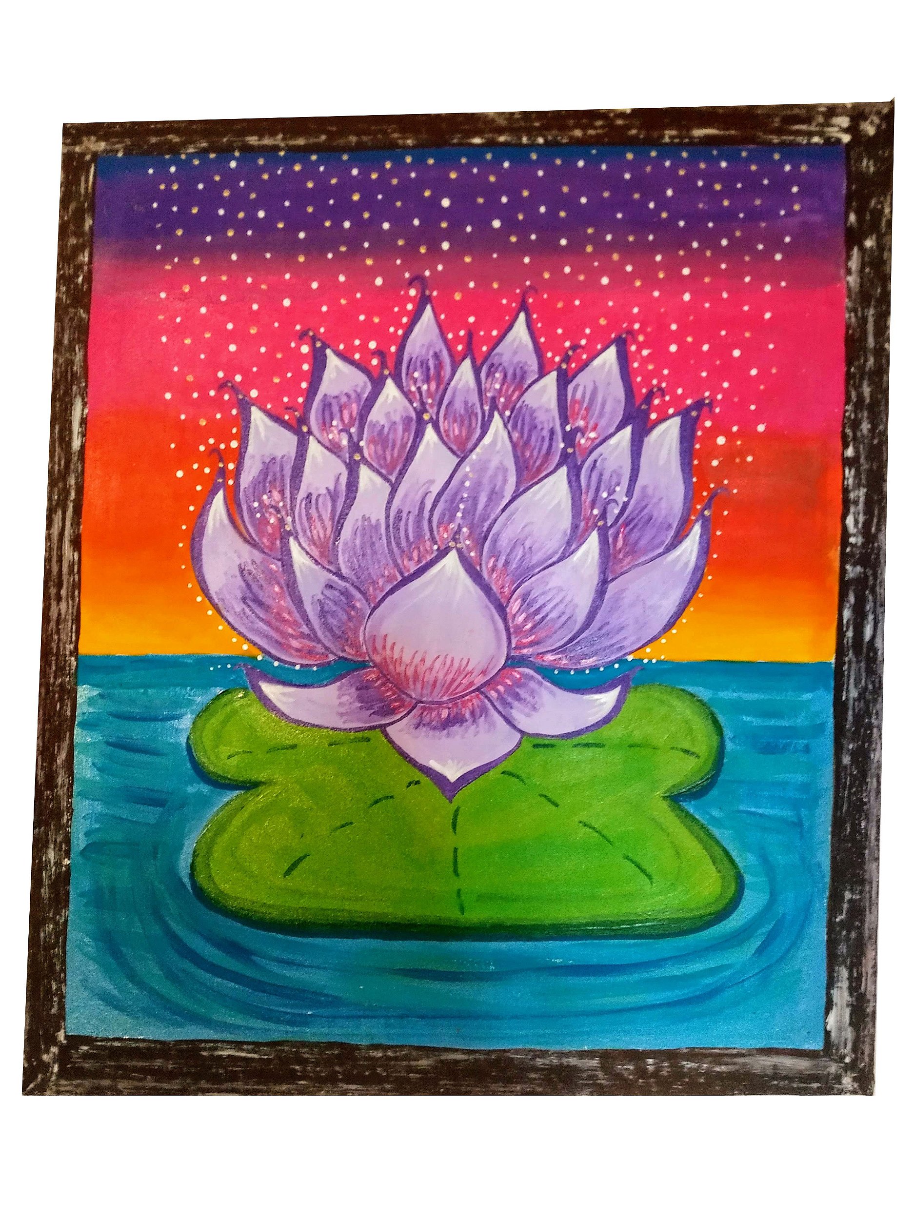 PINTURA EM TELA MEDINDO 40CM X 47CM. A FLOR DE LÓTUS VIOLETA REPRESENTA A CONEXÃO DIVINA, A LIGAÇÃO UNIVERSAL, É A COR DA TRANSMUTAÇÃO E DO CHAKRA CORONÁRIO.